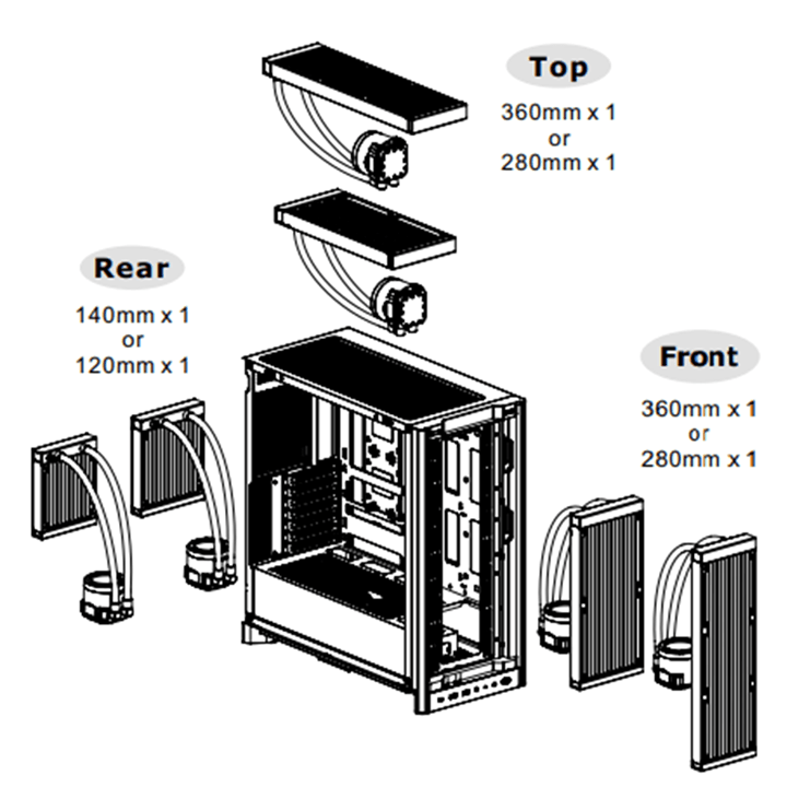Top Side(AIO) : 1 x 360mm, 1 x 240mm, 1 x 120mm 1 x 280mm, 1 x 140mm Front Side(AIO) : 1 x 360mm, 1 x 240mm, 1 x 120mm 1 x 280mm, 1 x 140mm Rear Side(AIO) : 1 x 120mm, 1 x 140mm |