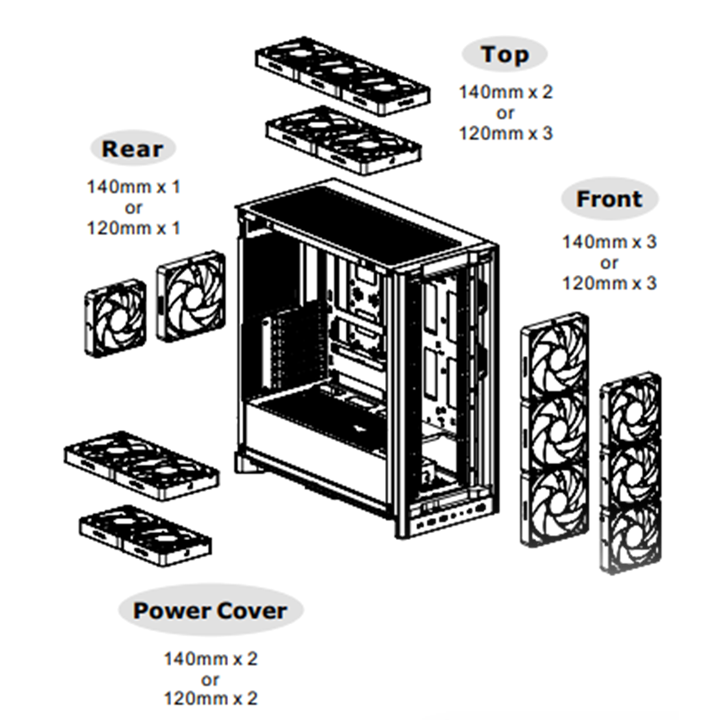 Top : 3 x 120mm 2 x 140mm Front : 3 x 120mm 3 x 140mm Rear : 1 x 120mm 1 x 140mm Power Cover : 2 x 120mm 2 x 140mm |