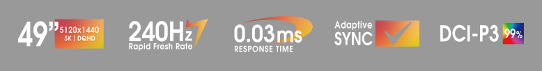 - 49 吋 DQHD(5120×1440)顯示器搭載 240Hz 高刷新率與 Fast IPS 技術,實現超快 0.03ms(GTG)反應時間,帶來極致流暢的視覺體驗。