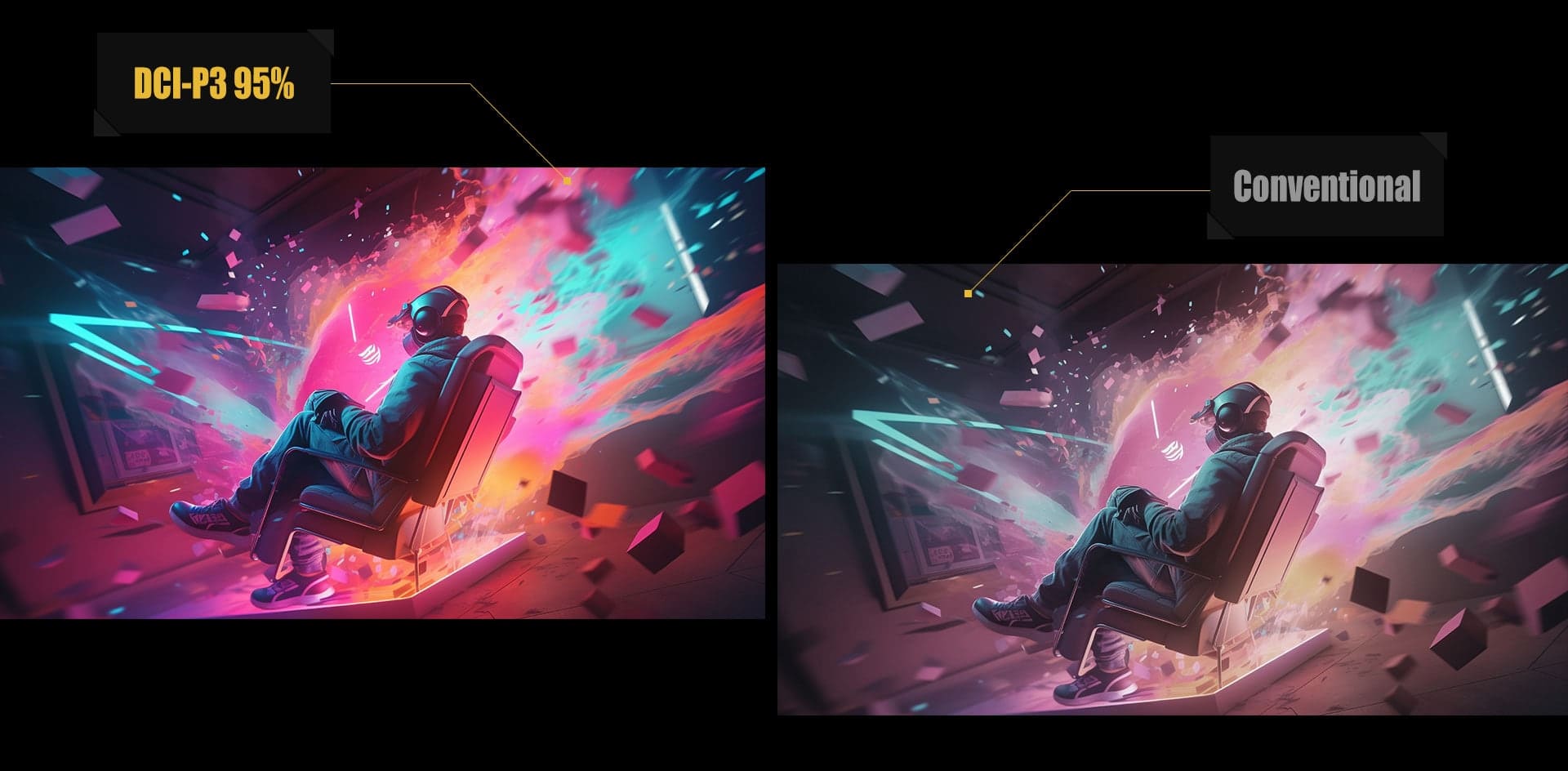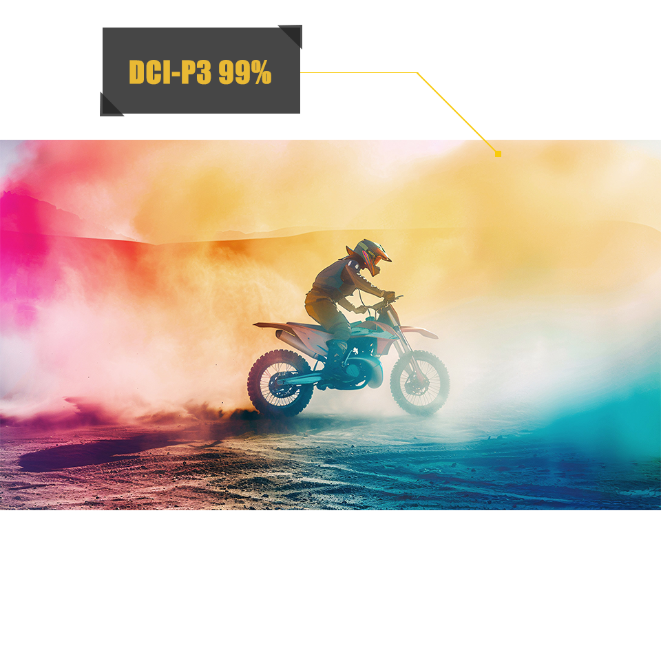 得益於 DCI-P3 99% 廣色域與 178 度超廣視角,OLED 技術帶來令人驚嘆的真實色彩與卓越影像表現。即使從側面觀看,畫面依然保持細膩飽滿、色彩準確,讓你從任何角度都能盡享極致視覺饗宴。