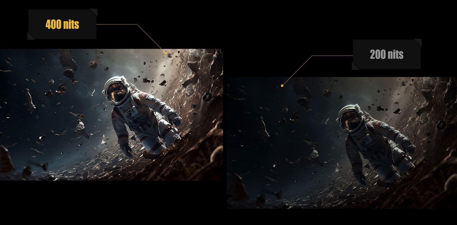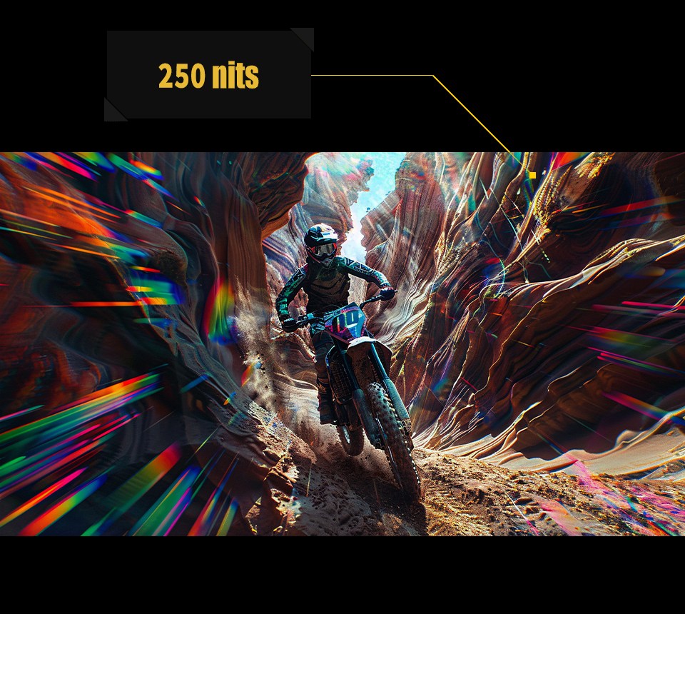 - 同時相容 HDR 高動態範圍顯示,擁有 250 nits 亮度與 DCI-P3 99% 廣色域,呈現出超越一般螢幕的亮度與色彩層次,帶來更真實鮮明的影像效果。