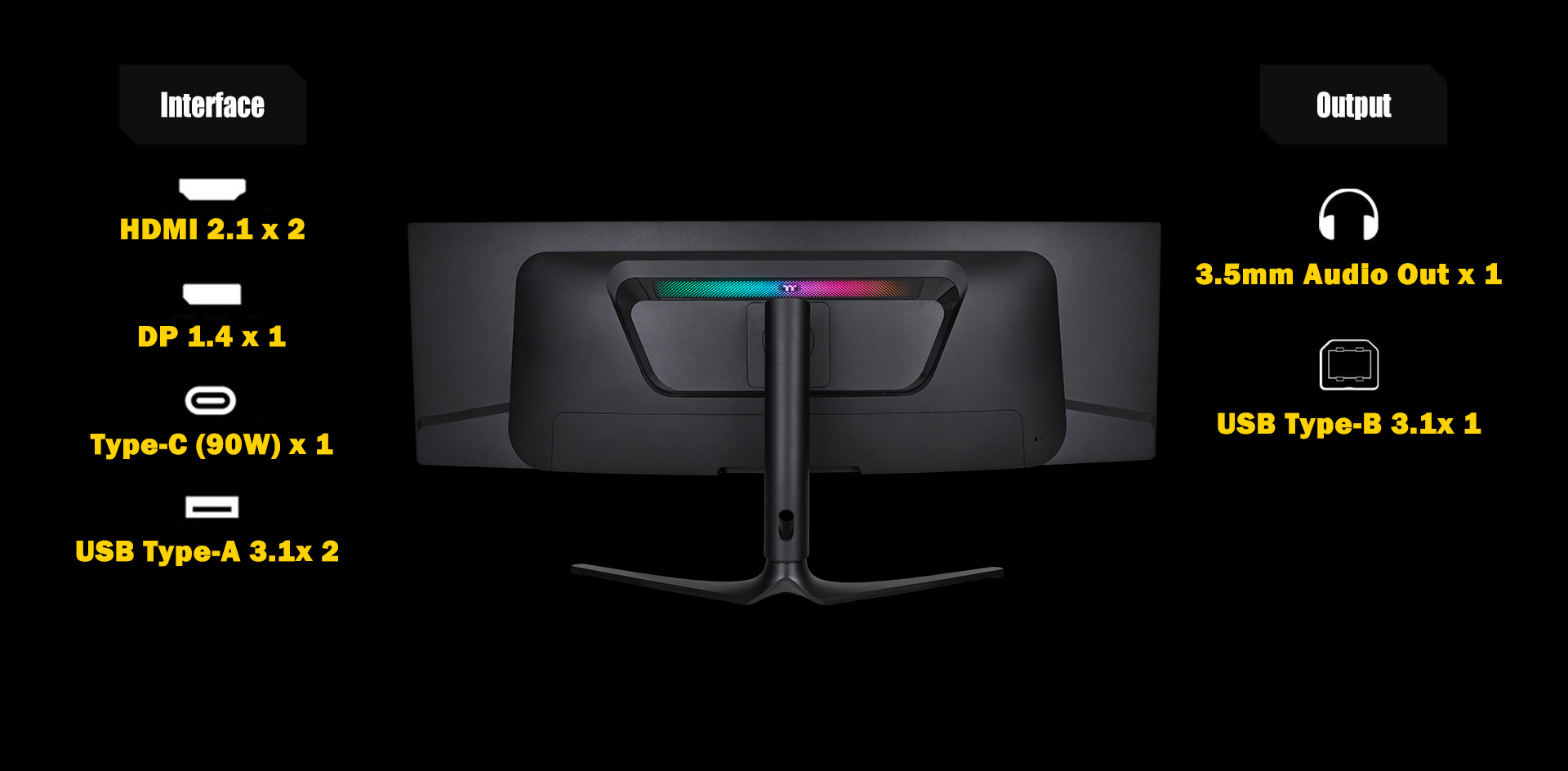 Input 1: HDMI 2.1 x 2 Input 2: DP 1.4 x 1 Input 3: Type-C 90W x 1 Input 4: DC IN x 1 Input 5: USB Up Port x1 |
